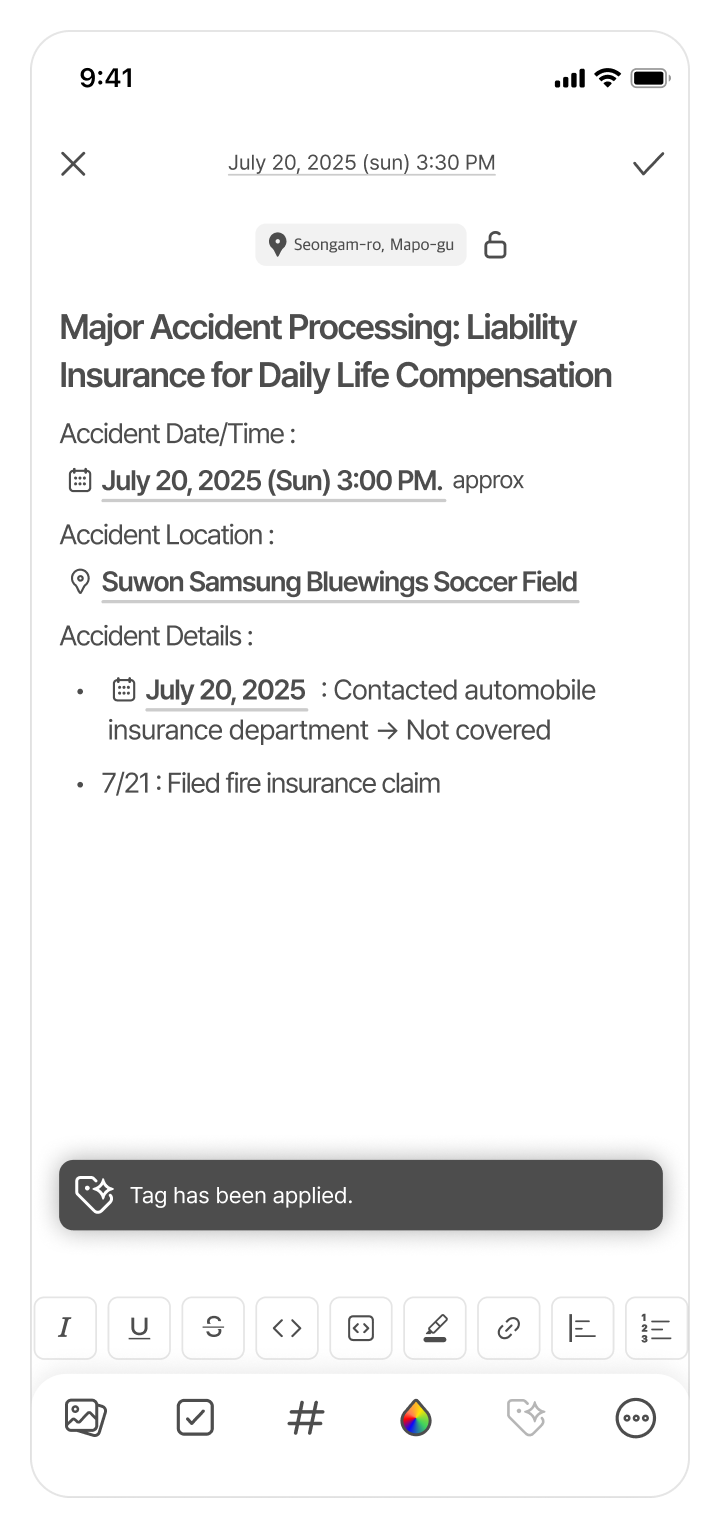 Extracts natural-language date/time and location mentions from your note and suggests tags. - One-tap Apply